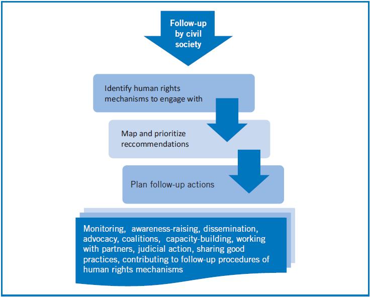 Sections 1 - 3 of this Guide explain 'follow-up' and 'implementation', while section 4 describes methods and activities that civil society actors (CSAs) can use. Section 5 reviews existing follow-up procedures and practices of UN human rights mechanisms and how CSAs can participate.